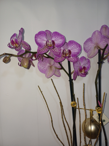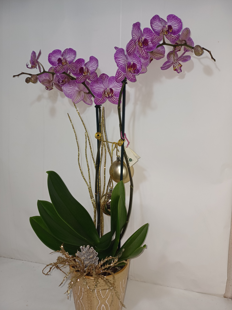 Phalenopsisin vaso di coccio con decorazioni natalizie